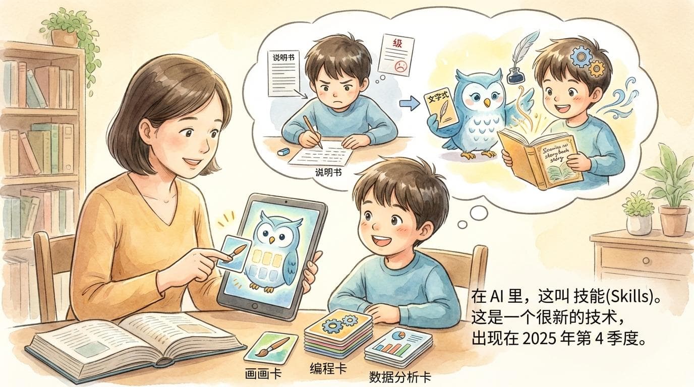 在 AI 里,这叫技能 (Skills)。这是一个很新的技术,出现在 2025 年第 4 季度。 你可以把 AI 想象成一个有很多“插槽”的超人。 虽然它本体只会说话,但你可以给它插上“画画卡”、“编程卡”、“数据分析卡”。